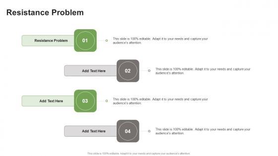 Introducing our well designed Resistance Problem In Powerpoint And Google Slides Cpb. This PowerPoint design presents information on topics like Resistance Problem. As it is predesigned it helps boost your confidence level. It also makes you a better presenter because of its high-quality content and graphics. This PPT layout can be downloaded and used in different formats like PDF, PNG, and JPG. Not only this, it is available in both Standard Screen and Widescreen aspect ratios for your convenience. Therefore, click on the download button now to persuade and impress your audience. Our Resistance Problem In Powerpoint And Google Slides Cpb are topically designed to provide an attractive backdrop to any subject. Use them to look like a presentation pro.