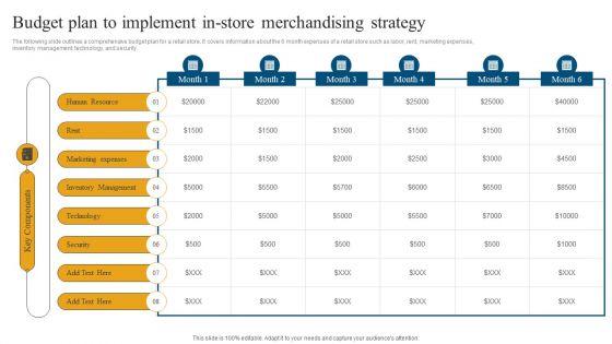 The following slide outlines a comprehensive budget plan for a retail store. It covers information about the 6 month expenses of a retail store such as labor, rent, marketing expenses, inventory management, technology, and security. Slidegeeks is one of the best resources for PowerPoint templates. You can download easily and regulate Retail Ecommerce Merchandising Tactics For Boosting Revenue Budget Plan To Implement In Store Ideas PDF for your personal presentations from our wonderful collection. A few clicks is all it takes to discover and get the most relevant and appropriate templates. Use our Templates to add a unique zing and appeal to your presentation and meetings. All the slides are easy to edit and you can use them even for advertisement purposes.