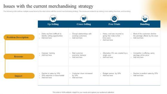 The following slide outlines multiple issues faced by the retail stores with the current merchandising strategy. The issues are related to up-selling, cross-selling, free trials, and bundling. If you are looking for a format to display your unique thoughts, then the professionally designed Retail Ecommerce Merchandising Tactics For Boosting Revenue Issues With The Current Merchandising Strategy Ideas PDF is the one for you. You can use it as a Google Slides template or a PowerPoint template. Incorporate impressive visuals, symbols, images, and other charts. Modify or reorganize the text boxes as you desire. Experiment with shade schemes and font pairings. Alter, share or cooperate with other people on your work. Download Retail Ecommerce Merchandising Tactics For Boosting Revenue Issues With The Current Merchandising Strategy Ideas PDF and find out how to give a successful presentation. Present a perfect display to your team and make your presentation unforgettable.