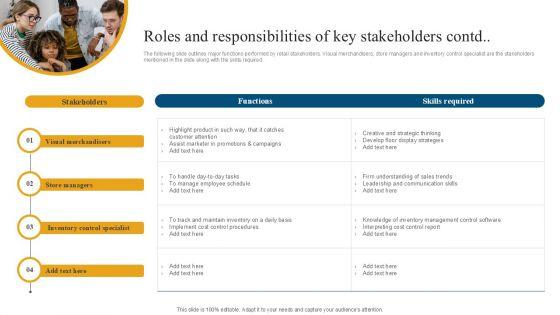 The following slide outlines major functions of retail stakeholders such as sales associates, cashiers and customer service representatives. It also covers information about the skills required of each stakeholder. Are you searching for a Retail Ecommerce Merchandising Tactics For Boosting Revenue Roles And Responsibilities Of Key Stakeholders Topics PDF that is uncluttered, straightforward, and original Its easy to edit, and you can change the colors to suit your personal or business branding. For a presentation that expresses how much effort you have put in, this template is ideal. With all of its features, including tables, diagrams, statistics, and lists, its perfect for a business plan presentation. Make your ideas more appealing with these professional slides. Download Retail Ecommerce Merchandising Tactics For Boosting Revenue Roles And Responsibilities Of Key Stakeholders Topics PDF from Slidegeeks today.