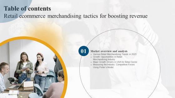 Here you can discover an assortment of the finest PowerPoint and Google Slides templates. With these templates, you can create presentations for a variety of purposes while simultaneously providing your audience with an eye catching visual experience. Download Retail Ecommerce Merchandising Tactics For Boosting Revenue Table Of Contents Structure PDF to deliver an impeccable presentation. These templates will make your job of preparing presentations much quicker, yet still, maintain a high level of quality. Slidegeeks has experienced researchers who prepare these templates and write high quality content for you. Later on, you can personalize the content by editing the Retail Ecommerce Merchandising Tactics For Boosting Revenue Table Of Contents Structure PDF.