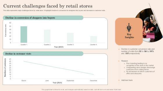 This slide represents major challenges faced by retail store. It highlights decline in conversion for shoppers into buyers and decrease in customer visits. Find a pre designed and impeccable Retail Promotion Strategies To Elevate Shopper Current Challenges Faced By Retail Stores Formats PDF. The templates can ace your presentation without additional effort. You can download these easy to edit presentation templates to make your presentation stand out from others. So, what are you waiting for Download the template from Slidegeeks today and give a unique touch to your presentation.