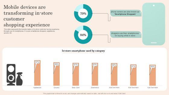 This slide represents the transformation of in-store customer buying experience through use of smartphones. It covers smartphone shoppers, appliances, grocery etc. From laying roadmaps to briefing everything in detail, our templates are perfect for you. You can set the stage with your presentation slides. All you have to do is download these easy to edit and customizable templates. Retail Promotion Strategies To Elevate Shopper Mobile Devices Are Transforming In Store Template PDF will help you deliver an outstanding performance that everyone would remember and praise you for. Do download this presentation today.