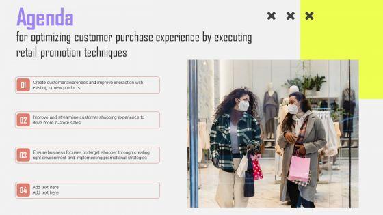 Presenting this PowerPoint presentation, titled Agenda For Optimizing Customer Purchase Experience By Executing Retail Promotion Techniques Rules PDF, with topics curated by our researchers after extensive research. This editable presentation is available for immediate download and provides attractive features when used. Download now and captivate your audience. Presenting this Agenda For Optimizing Customer Purchase Experience By Executing Retail Promotion Techniques Rules PDF. Our researchers have carefully researched and created these slides with all aspects taken into consideration. This is a completely customizable Agenda For Optimizing Customer Purchase Experience By Executing Retail Promotion Techniques Rules PDF that is available for immediate downloading. Download now and make an impact on your audience. Highlight the attractive features available with our PPTs.