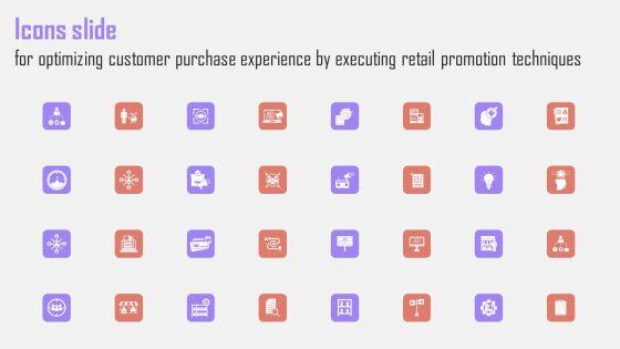 Introducing our well designed Icons Slide For Optimizing Customer Purchase Experience By Executing Retail Promotion Techniques Slides PDF set of slides. The slide displays editable icons to enhance your visual presentation. The icons can be edited easily. So customize according to your business to achieve a creative edge. Download and share it with your audience.