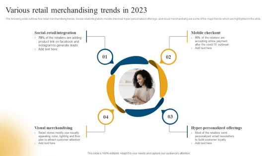 The following slide outlines four retail merchandising trends. Social-retail integration, mobile checkout, hyper-personalized offerings, and visual merchandising are some of the major trends which are highlighted in the slide. This Retail Ecommerce Merchandising Tactics For Boosting Revenue Various Retail Merchandising Trends In 2023 Background PDF from Slidegeeks makes it easy to present information on your topic with precision. It provides customization options, so you can make changes to the colors, design, graphics, or any other component to create a unique layout. It is also available for immediate download, so you can begin using it right away. Slidegeeks has done good research to ensure that you have everything you need to make your presentation stand out. Make a name out there for a brilliant performance.