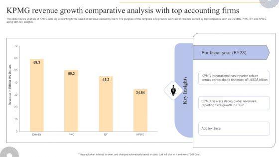 This slide covers analysis of KPMG with big accounting firms based on revenue earned by them. The purpose of this template is to provide overview of revenue earned by top companies such as Deloittte, PwC, EY and KPMG along with key insights. Formulating a presentation can take up a lot of effort and time, so the content and message should always be the primary focus. The visuals of the PowerPoint can enhance the presenters message, so our KPMG Revenue Growth Comparative Analysis With Top Accounting Firms Topics PDF was created to help save time. Instead of worrying about the design, the presenter can concentrate on the message while our designers work on creating the ideal templates for whatever situation is needed. Slidegeeks has experts for everything from amazing designs to valuable content, we have put everything into KPMG Revenue Growth Comparative Analysis With Top Accounting Firms Topics PDF