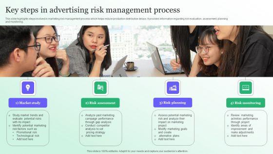This slide highlights steps involved in marketing risk management process which helps reduce production distribution delays. It provides information regarding risk evaluation, assessment, planning and monitoring. Presenting Key Steps In Advertising Risk Management Process Template PDF to dispense important information. This template comprises four stages. It also presents valuable insights into the topics including Market Study, Risk Assessment, Risk Planning, Risk Monitoring. This is a completely customizable PowerPoint theme that can be put to use immediately. So, download it and address the topic impactfully.