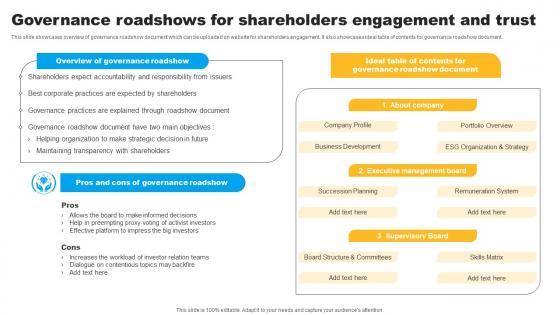 This slide showcases overview of governance roadshow document which can be uploaded on website for shareholders engagement. It also showcases ideal table of contents for governance roadshow document. Do you have an important presentation coming up Are you looking for something that will make your presentation stand out from the rest Look no further than Communication Means And Techniques Governance Roadshows For Shareholders Portrait PDF. With our professional designs, you can trust that your presentation will pop and make delivering it a smooth process. And with Slidegeeks, you can trust that your presentation will be unique and memorable. So why wait Grab Communication Means And Techniques Governance Roadshows For Shareholders Portrait PDF today and make your presentation stand out from the rest.