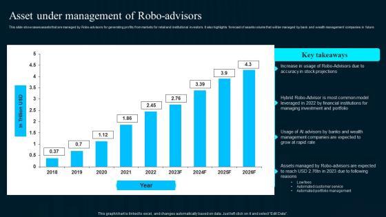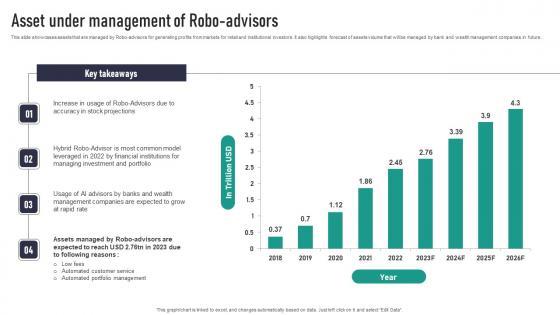 This slide showcases assets that are managed by Robo-advisors for generating profits from markets for retail and institutional investors. It also highlights forecast of assets volume that will be managed by bank and wealth management companies in future. Slidegeeks is one of the best resources for PowerPoint templates. You can download easily and regulate Asset Under Management Of Robo Advisors Professional Pdf for your personal presentations from our wonderful collection. A few clicks is all it takes to discover and get the most relevant and appropriate templates. Use our Templates to add a unique zing and appeal to your presentation and meetings. All the slides are easy to edit and you can use them even for advertisement purposes. This slide showcases assets that are managed by Robo-advisors for generating profits from markets for retail and institutional investors. It also highlights forecast of assets volume that will be managed by bank and wealth management companies in future.