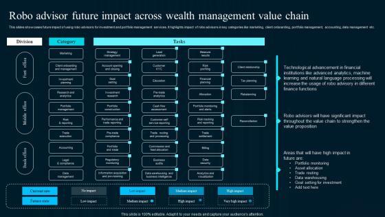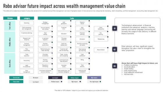 This slides showcases future impact of using robo advisors for investment and portfolio management services. It highlights impact of robo advisors in key categories like marketing, client onboarding, portfolio management, accounting, data management etc. Here you can discover an assortment of the finest PowerPoint and Google Slides templates. With these templates, you can create presentations for a variety of purposes while simultaneously providing your audience with an eye-catching visual experience. Download Robo Advisor Future Impact Across Wealth Management Value Chain Designs Pdf to deliver an impeccable presentation. These templates will make your job of preparing presentations much quicker, yet still, maintain a high level of quality. Slidegeeks has experienced researchers who prepare these templates and write high-quality content for you. Later on, you can personalize the content by editing the Robo Advisor Future Impact Across Wealth Management Value Chain Designs Pdf. This slides showcases future impact of using robo advisors for investment and portfolio management services. It highlights impact of robo advisors in key categories like marketing, client onboarding, portfolio management, accounting, data management etc.