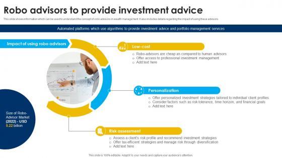 This slide shows information which can be used to understand the concept of Robo advisors in investment banking. It also includes details regarding the impact of using these advisors. Do you have to make sure that everyone on your team knows about any specific topic I yes, then you should give Robo Advisors To Provide Investment Banking Simplified Functions Fin SS V a try. Our experts have put a lot of knowledge and effort into creating this impeccable Robo Advisors To Provide Investment Banking Simplified Functions Fin SS V. You can use this template for your upcoming presentations, as the slides are perfect to represent even the tiniest detail. You can download these templates from the Slidegeeks website and these are easy to edit. So grab these today This slide shows information which can be used to understand the concept of Robo advisors in investment banking. It also includes details regarding the impact of using these advisors.