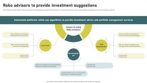 This slide shows information which can be used to understand the concept of Robo advisors in investment banking. It also includes details regarding the impact of using these advisors. Are you searching for a Robo Advisors To Provide Investment Suggestions Understanding Investment Banking Framework Fin SS V that is uncluttered, straightforward, and original Its easy to edit, and you can change the colors to suit your personal or business branding. For a presentation that expresses how much effort you have put in, this template is ideal With all of its features, including tables, diagrams, statistics, and lists, its perfect for a business plan presentation. Make your ideas more appealing with these professional slides. Download Robo Advisors To Provide Investment Suggestions Understanding Investment Banking Framework Fin SS V from Slidegeeks today. This slide shows information which can be used to understand the concept of Robo advisors in investment banking. It also includes details regarding the impact of using these advisors.