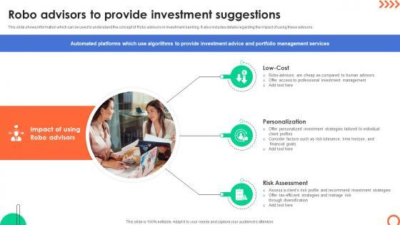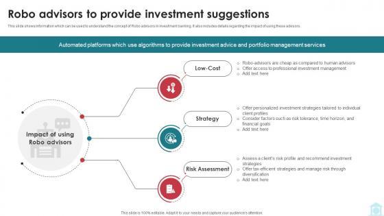 This slide shows information which can be used to understand the concept of Robo advisors in investment banking. It also includes details regarding the impact of using these advisors. Do you have to make sure that everyone on your team knows about any specific topic I yes, then you should give Robo Advisors To Provide Investment Suggestions Mastering Investment Banking Fin SS V a try. Our experts have put a lot of knowledge and effort into creating this impeccable Robo Advisors To Provide Investment Suggestions Mastering Investment Banking Fin SS V You can use this template for your upcoming presentations, as the slides are perfect to represent even the tiniest detail. You can download these templates from the Slidegeeks website and these are easy to edit. So grab these today This slide shows information which can be used to understand the concept of Robo advisors in investment banking. It also includes details regarding the impact of using these advisors.