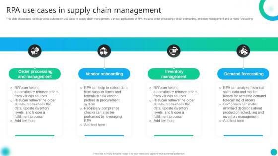 This slide showcases robotic process automation use cases in supply chain management. Various applications of RPA includes order processing vendor onboarding, inventory management and demand forecasting. There are so many reasons you need a RPA Use Cases In Supply Chain Management PPT Example AI SS V. The first reason is you can not spend time making everything from scratch, Thus, Slidegeeks has made presentation templates for you too. You can easily download these templates from our website easily. This slide showcases robotic process automation use cases in supply chain management. Various applications of RPA includes order processing vendor onboarding, inventory management and demand forecasting.