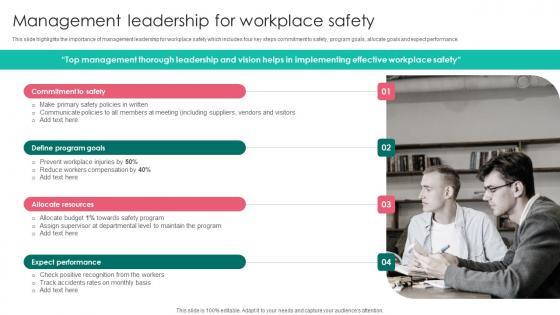 This slide highlights the importance of management leadership for workplace safety which includes four key steps commitment to safety, program goals, allocate goals and expect performance. Make sure to capture your audiences attention in your business displays with our gratis customizable Workplace Safety Best Practices Management Leadership Structure PDF. These are great for business strategies, office conferences, capital raising or task suggestions. If you desire to acquire more customers for your tech business and ensure they stay satisfied, create your own sales presentation with these plain slides.