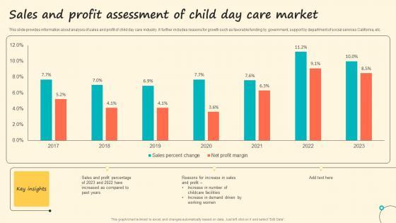 This slide provides information about analysis of sales and profit of child day care industry. It further includes reasons for growth such as favorable funding by government, support by department of social services California, etc. Showcasing this set of slides titled Sales And Profit Assessment Of Child Day Care Market Sample Pdf The topics addressed in these templates are Sales And Profit Assessment, Child Day Care Market All the content presented in this PPT design is completely editable. Download it and make adjustments in color, background, font etc. as per your unique business setting. This slide provides information about analysis of sales and profit of child day care industry. It further includes reasons for growth such as favorable funding by government, support by department of social services California, etc.