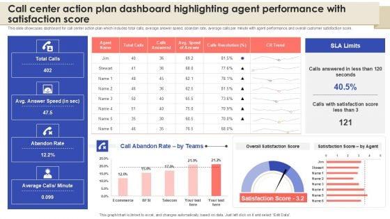 This slide showcases dashboard for call center action plan which includes total calls, average answer speed, abandon rate, average calls per minute with agent performance and overall customer satisfaction score. Here you can discover an assortment of the finest PowerPoint and Google Slides templates. With these templates, you can create presentations for a variety of purposes while simultaneously providing your audience with an eye catching visual experience. Download Call Center Action Plan Dashboard Highlighting Agent Performance With Satisfaction Score Slides PDF to deliver an impeccable presentation. These templates will make your job of preparing presentations much quicker, yet still, maintain a high level of quality. Slidegeeks has experienced researchers who prepare these templates and write high quality content for you. Later on, you can personalize the content by editing the Call Center Action Plan Dashboard Highlighting Agent Performance With Satisfaction Score Slides PDF.