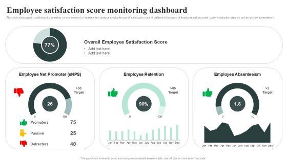 This slide showcases a dashboard presenting various metrics to measure and analyze employee overall satisfaction rate. It outlines information of employee net promoter score, employee retention and employee absenteeism. Are you in need of a template that can accommodate all of your creative concepts This one is crafted professionally and can be altered to fit any style. Use it with Google Slides or PowerPoint. Include striking photographs, symbols, depictions, and other visuals. Fill, move around, or remove text boxes as desired. Test out color palettes and font mixtures. Edit and save your work, or work with colleagues. Download Employee Satisfaction Score Monitoring Dashboard Slides PDF and observe how to make your presentation outstanding. Give an impeccable presentation to your group and make your presentation unforgettable.