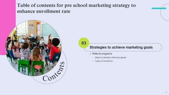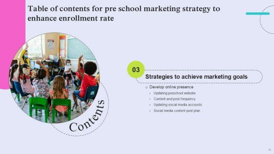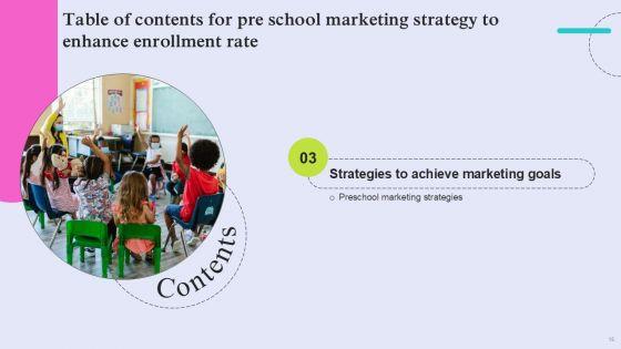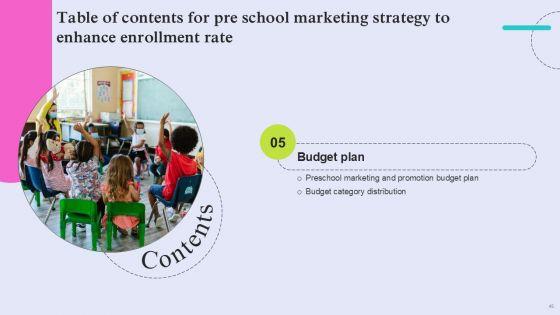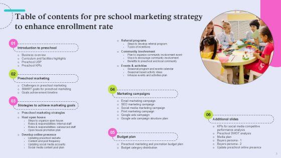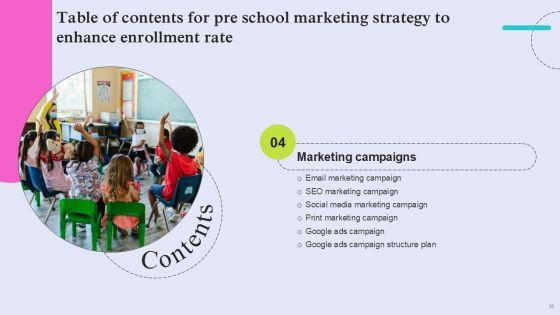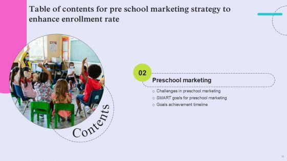 Slidegeeks is here to make your presentations a breeze with Table Of Contents For Pre School Marketing Strategy To Enhance Enrollment Rate Elements PDF With our easy to use and customizable templates, you can focus on delivering your ideas rather than worrying about formatting. With a variety of designs to choose from, you are sure to find one that suits your needs. And with animations and unique photos, illustrations, and fonts, you can make your presentation pop. So whether you are giving a sales pitch or presenting to the board, make sure to check out Slidegeeks first.