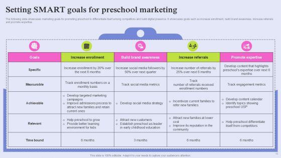 The following slide showcases marketing goals for promoting preschool to differentiate itself among competitors and build digital presence. It showcases goals such as increase enrollment, build brand awareness, increase referrals and promote expertise. This Pre School Marketing Strategy To Enhance Enrollment Rate Setting Smart Goals For Preschool Topics PDF from Slidegeeks makes it easy to present information on your topic with precision. It provides customization options, so you can make changes to the colors, design, graphics, or any other component to create a unique layout. It is also available for immediate download, so you can begin using it right away. Slidegeeks has done good research to ensure that you have everything you need to make your presentation stand out. Make a name out there for a brilliant performance.