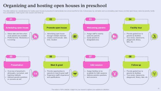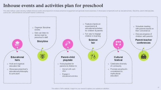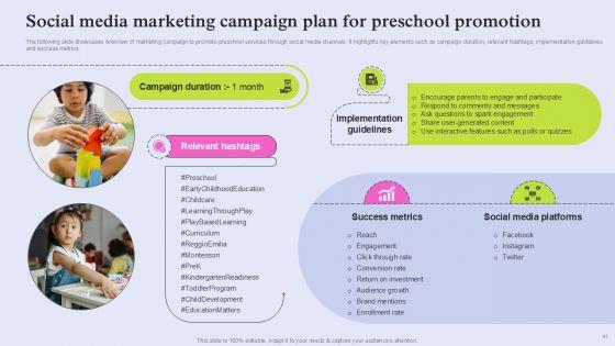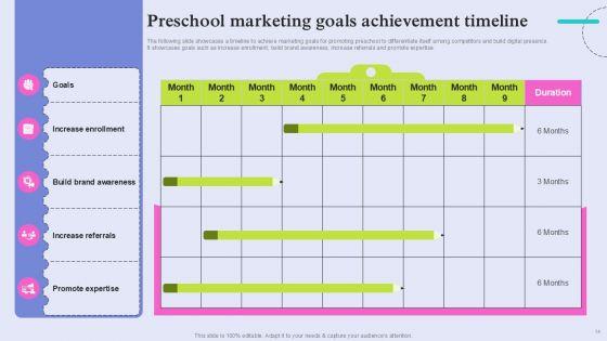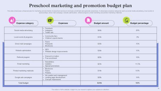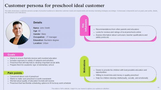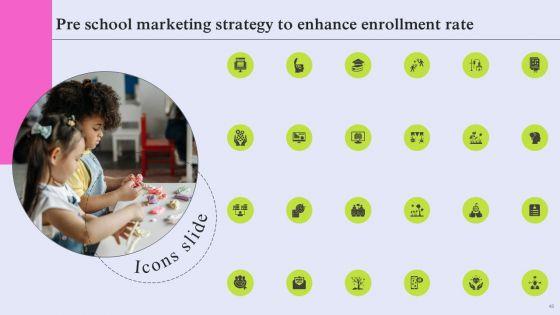 You will save yourself your energy and hours of time when you choose to use this impactful PowerPoint Deck. This Pre School Marketing Strategy To Enhance Enrollment Rate Ppt PowerPoint Presentation Complete Deck With Slides has been tailor-made to your business needs which ensures that you will always be prepared for that next meeting. Worry can not touch you when you present in your area of expertise using this PPT Template Bundle. With a modern design and easy to follow structure, this PowerPoint Presentation has fifty six slides, which ensures that you can cover you need to without much work. Create your next presentation using this PPT Theme to deliver a memorable performance.