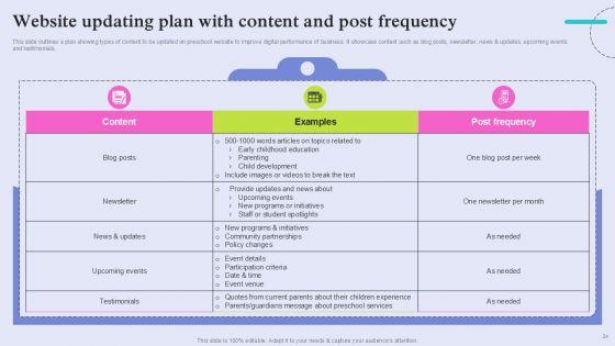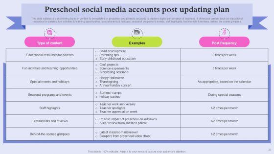 This slide outlines a plan showing types of content to be updated on preschool social media accounts to improve digital performance of business. It showcase content such as educational resources for parents, fun activities and learning opportunities, special events and holidays, seasonal programs and events, staff highlights, testimonials and reviews, behind the scene glimpses. Explore a selection of the finest Pre School Marketing Strategy To Enhance Enrollment Rate Preschool Social Media Accounts Post Rules PDF here. With a plethora of professionally designed and pre made slide templates, you can quickly and easily find the right one for your upcoming presentation. You can use our Pre School Marketing Strategy To Enhance Enrollment Rate Preschool Social Media Accounts Post Rules PDF to effectively convey your message to a wider audience. Slidegeeks has done a lot of research before preparing these presentation templates. The content can be personalized and the slides are highly editable. Grab templates today from Slidegeeks.