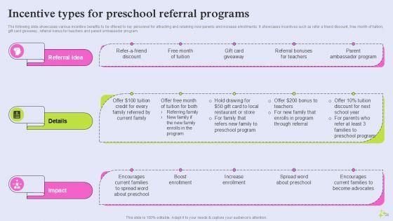 The following slide showcases various incentive benefits to be offered to key personnel for attracting and retaining new parents and increase enrollments. It showcases incentives such as refer a friend discount, free month of tuition, gift card giveaway, referral bonus for teachers and parent ambassador program. Make sure to capture your audiences attention in your business displays with our gratis customizable Pre School Marketing Strategy To Enhance Enrollment Rate Incentive Types For Preschool Sample PDF. These are great for business strategies, office conferences, capital raising or task suggestions. If you desire to acquire more customers for your tech business and ensure they stay satisfied, create your own sales presentation with these plain slides.