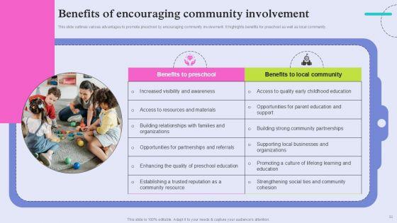 This slide outlines various advantages to promote preschool by encouraging community involvement. It highlights benefits for preschool as well as local community. Create an editable Pre School Marketing Strategy To Enhance Enrollment Rate Benefits Of Encouraging Community Microsoft PDF that communicates your idea and engages your audience. Whether you are presenting a business or an educational presentation, pre designed presentation templates help save time. Pre School Marketing Strategy To Enhance Enrollment Rate Benefits Of Encouraging Community Microsoft PDF is highly customizable and very easy to edit, covering many different styles from creative to business presentations. Slidegeeks has creative team members who have crafted amazing templates. So, go and get them without any delay.