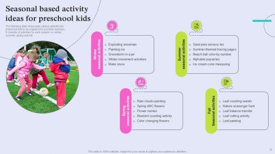 The following slide showcases various activities for preschool kids to be organized to promote business . It consists of activities for each season i.e. winter, summer, spring and fall. If your project calls for a presentation, then Slidegeeks is your go to partner because we have professionally designed, easy to edit templates that are perfect for any presentation. After downloading, you can easily edit Pre School Marketing Strategy To Enhance Enrollment Rate Seasonal Based Activity Ideas For Preschool Infographics PDF and make the changes accordingly. You can rearrange slides or fill them with different images. Check out all the handy templates.