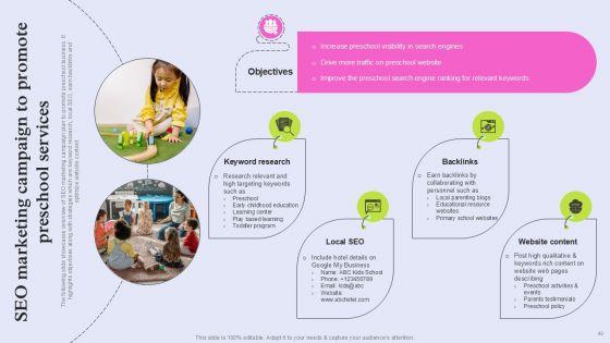 The following slide showcases overview of SEO marketing campaign plan to promote preschool business. It highlights objectives along with strategies which are keyword research, local SEO, earn backlinks and optimize website content. Retrieve professionally designed Pre School Marketing Strategy To Enhance Enrollment Rate Seo Marketing Campaign To Promote Professional PDF to effectively convey your message and captivate your listeners. Save time by selecting pre made slideshows that are appropriate for various topics, from business to educational purposes. These themes come in many different styles, from creative to corporate, and all of them are easily adjustable and can be edited quickly. Access them as PowerPoint templates or as Google Slides themes. You do not have to go on a hunt for the perfect presentation because Slidegeeks got you covered from everywhere.
