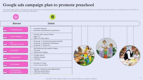 The following slide outlines a campaign plan using google ads for promoting preschool services and increase enrollment. It showcases key elements such as campaign goals, target audience, ad campaign structure, ad format. Ad placement, ad schedule and ad monitoring and optimization. There are so many reasons you need a Pre School Marketing Strategy To Enhance Enrollment Rate Google Ads Campaign Plan Portrait PDF. The first reason is you can not spend time making everything from scratch, Thus, Slidegeeks has made presentation templates for you too. You can easily download these templates from our website easily.