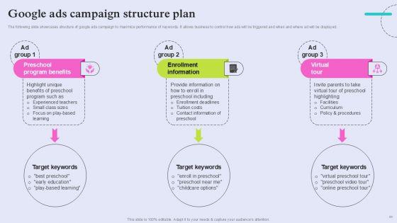 The following slide showcases structure of google ads campaign to maximize performance of keywords. It allows business to control how ads will be triggered and when and where ad will be displayed. Do you have to make sure that everyone on your team knows about any specific topic I yes, then you should give Pre School Marketing Strategy To Enhance Enrollment Rate Google Ads Campaign Structure Plan Summary PDF a try. Our experts have put a lot of knowledge and effort into creating this impeccable Pre School Marketing Strategy To Enhance Enrollment Rate Google Ads Campaign Structure Plan Summary PDF. You can use this template for your upcoming presentations, as the slides are perfect to represent even the tiniest detail. You can download these templates from the Slidegeeks website and these are easy to edit. So grab these today.