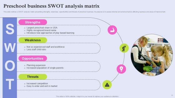 This slide outlines a SWOT analysis matrix presenting strengths, weakness, opportunities and threats of preschool business. Its purpose is to assess internal and external factors affecting business and areas of improvement. Whether you have daily or monthly meetings, a brilliant presentation is necessary. Pre School Marketing Strategy To Enhance Enrollment Rate Preschool Business SWOT Professional PDF can be your best option for delivering a presentation. Represent everything in detail using Pre School Marketing Strategy To Enhance Enrollment Rate Preschool Business SWOT Professional PDF and make yourself stand out in meetings. The template is versatile and follows a structure that will cater to your requirements. All the templates prepared by Slidegeeks are easy to download and edit. Our research experts have taken care of the corporate themes as well. So, give it a try and see the results.