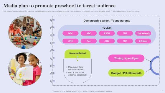 This slide outlines a media plan for preschool marketing and promotions among target audience. It showcases key components such as demographic target, TV ads, season or period, timing and budget. Slidegeeks is here to make your presentations a breeze with Pre School Marketing Strategy To Enhance Enrollment Rate Media Plan To Promote Preschool Graphics PDF With our easy to use and customizable templates, you can focus on delivering your ideas rather than worrying about formatting. With a variety of designs to choose from, you are sure to find one that suits your needs. And with animations and unique photos, illustrations, and fonts, you can make your presentation pop. So whether you are giving a sales pitch or presenting to the board, make sure to check out Slidegeeks first.