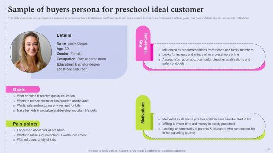 This slide showcases a customer persona sample of preschool audience to determine customer needs and requirements and develop marketing strategies accordingly. It showcases components such as goals, pain points, details, key influencers and motivations. Slidegeeks is one of the best resources for PowerPoint templates. You can download easily and regulate Pre School Marketing Strategy To Enhance Enrollment Rate Customer Persona For Preschool Designs PDF for your personal presentations from our wonderful collection. A few clicks is all it takes to discover and get the most relevant and appropriate templates. Use our Templates to add a unique zing and appeal to your presentation and meetings. All the slides are easy to edit and you can use them even for advertisement purposes.