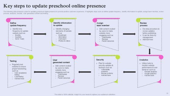 The following slide presents a plan for updating preschool digital presence to provide positive customer experience. It highlights steps such as define update frequency, identify information to update, assign team member, review process, analytics, security, user generated content and testing. Present like a pro with Pre School Marketing Strategy To Enhance Enrollment Rate Key Steps To Update Preschool Rules PDF Create beautiful presentations together with your team, using our easy to use presentation slides. Share your ideas in real time and make changes on the fly by downloading our templates. So whether you are in the office, on the go, or in a remote location, you can stay in sync with your team and present your ideas with confidence. With Slidegeeks presentation got a whole lot easier. Grab these presentations today.