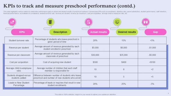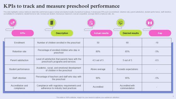 This slide highlights various metrics to determine performance gaps in actual and desired results of preschool business. It showcases KPIs such as enrollment, retention rate, parent satisfaction, student performance, staff retention, accreditation and compliance, student turnover rate, revenue per student, revenue pe classroom, cost per acquisition, average child to employee ratio, etc. Coming up with a presentation necessitates that the majority of the effort goes into the content and the message you intend to convey. The visuals of a PowerPoint presentation can only be effective if it supplements and supports the story that is being told. Keeping this in mind our experts created Pre School Marketing Strategy To Enhance Enrollment Rate Kpis To Track And Measure Preschool Diagrams PDF to reduce the time that goes into designing the presentation. This way, you can concentrate on the message while our designers take care of providing you with the right template for the situation.