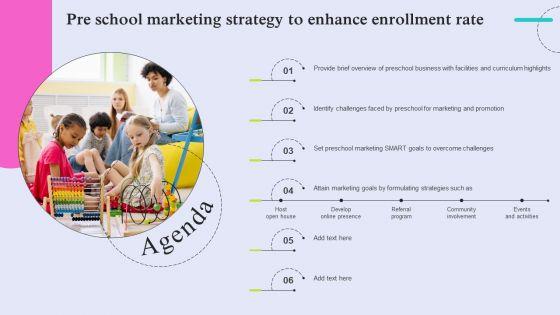 If you are looking for a format to display your unique thoughts, then the professionally designed Agenda Pre School Marketing Strategy To Enhance Enrollment Rate Ideas PDF is the one for you. You can use it as a Google Slides template or a PowerPoint template. Incorporate impressive visuals, symbols, images, and other charts. Modify or reorganize the text boxes as you desire. Experiment with shade schemes and font pairings. Alter, share or cooperate with other people on your work. Download Agenda Pre School Marketing Strategy To Enhance Enrollment Rate Ideas PDF and find out how to give a successful presentation. Present a perfect display to your team and make your presentation unforgettable.