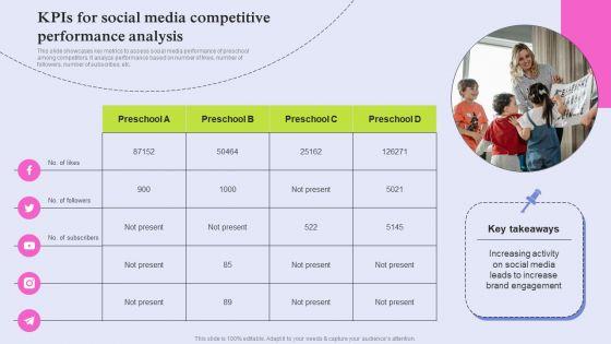 This slide showcases key metrics to assess social media performance of preschool among competitors. It analyze performance based on number of likes, number of followers, number of subscribes, etc. Formulating a presentation can take up a lot of effort and time, so the content and message should always be the primary focus. The visuals of the PowerPoint can enhance the presenters message, so our Pre School Marketing Strategy To Enhance Enrollment Rate Kpis For Social Media Competitive Information PDF was created to help save time. Instead of worrying about the design, the presenter can concentrate on the message while our designers work on creating the ideal templates for whatever situation is needed. Slidegeeks has experts for everything from amazing designs to valuable content, we have put everything into Pre School Marketing Strategy To Enhance Enrollment Rate Kpis For Social Media Competitive Information PDF.