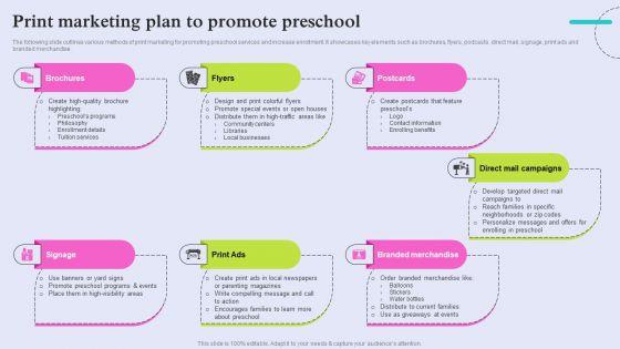 The following slide outlines various methods of print marketing for promoting preschool services and increase enrollment. It showcases key elements such as brochures, flyers, podcasts, direct mail, signage, print ads and branded merchandise. The best PPT templates are a great way to save time, energy, and resources. Slidegeeks have 100 percent editable powerpoint slides making them incredibly versatile. With these quality presentation templates, you can create a captivating and memorable presentation by combining visually appealing slides and effectively communicating your message. Download Pre School Marketing Strategy To Enhance Enrollment Rate Print Marketing Plan To Promote Inspiration PDF from Slidegeeks and deliver a wonderful presentation.
