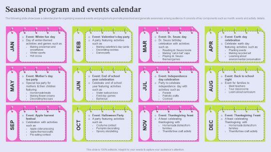 The following slide showcases a calendar plan for organizing seasonal events and programs to promote preschool and generate awareness among audience. It consists of key components such as month, events and activity details. Are you searching for a Pre School Marketing Strategy To Enhance Enrollment Rate Seasonal Program And Events Calendar Infographics PDF that is uncluttered, straightforward, and original Its easy to edit, and you can change the colors to suit your personal or business branding. For a presentation that expresses how much effort you have put in, this template is ideal With all of its features, including tables, diagrams, statistics, and lists, its perfect for a business plan presentation. Make your ideas more appealing with these professional slides. Download Pre School Marketing Strategy To Enhance Enrollment Rate Seasonal Program And Events Calendar Infographics PDF from Slidegeeks today.