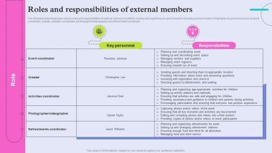 The following slide showcases various roles and responsibilities of external outsourced staff for hosting and organizing an open house for marketing and promotion. It highlights key personnel such as event coordinator, greeter, activities coordinator, photographer or videographer and refreshment coordinator. Here you can discover an assortment of the finest PowerPoint and Google Slides templates. With these templates, you can create presentations for a variety of purposes while simultaneously providing your audience with an eye catching visual experience. Download Pre School Marketing Strategy To Enhance Enrollment Rate Roles And Responsibilities Of External Professional PDF to deliver an impeccable presentation. These templates will make your job of preparing presentations much quicker, yet still, maintain a high level of quality. Slidegeeks has experienced researchers who prepare these templates and write high quality content for you. Later on, you can personalize the content by editing the Pre School Marketing Strategy To Enhance Enrollment Rate Roles And Responsibilities Of External Professional PDF.