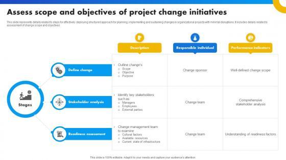 This slide represents details related to steps for effectively deploying structured approach for planning, implementing and sustaining changes in organizational projects with minimal disruptions. It includes details related to assessment of change scope and objectives. Boost your pitch with our creative Digital Project Management Strategies Assess Scope And Objectives Of Project Change Initiatives. Deliver an awe-inspiring pitch that will mesmerize everyone. Using these presentation templates you will surely catch everyones attention. You can browse the ppts collection on our website. We have researchers who are experts at creating the right content for the templates. So you do not have to invest time in any additional work. Just grab the template now and use them. This slide represents details related to steps for effectively deploying structured approach for planning, implementing and sustaining changes in organizational projects with minimal disruptions. It includes details related to assessment of change scope and objectives.