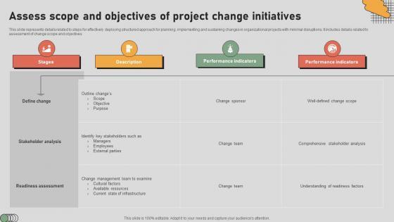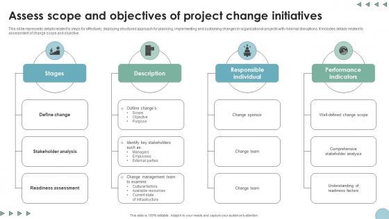 This slide represents details related to steps for effectively deploying structured approach for planning, implementing and sustaining changes in organizational projects with minimal disruptions. It includes details related to assessment of change scope and objectives. Boost your pitch with our creative Assess Scope And Objectives Of Project Change Initiatives Strategies For Success In Digital. Deliver an awe-inspiring pitch that will mesmerize everyone. Using these presentation templates you will surely catch everyones attention. You can browse the ppts collection on our website. We have researchers who are experts at creating the right content for the templates. So you do not have to invest time in any additional work. Just grab the template now and use them. This slide represents details related to steps for effectively deploying structured approach for planning, implementing and sustaining changes in organizational projects with minimal disruptions. It includes details related to assessment of change scope and objectives.
