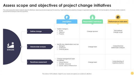 This slide represents details related to steps for effectively deploying structured approach for planning, implementing and sustaining changes in organizational projects with minimal disruptions. It includes details related to assessment of change scope and objective. Boost your pitch with our creative Assess Scope And Objectives Of Project Digital Transformation In Project Management. Deliver an awe-inspiring pitch that will mesmerize everyone. Using these presentation templates you will surely catch everyones attention. You can browse the ppts collection on our website. We have researchers who are experts at creating the right content for the templates. So you do not have to invest time in any additional work. Just grab the template now and use them. This slide represents details related to steps for effectively deploying structured approach for planning, implementing and sustaining changes in organizational projects with minimal disruptions. It includes details related to assessment of change scope and objective