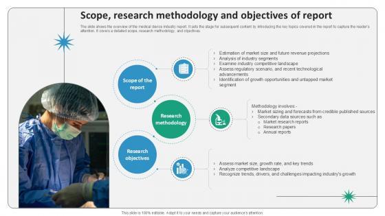 The slide shows the overview of the medical device industry report. It sets the stage for subsequent content by introducing the key topics covered in the report to capture the readers attention. It covers a detailed scope, research methodology, and objectives. Do you have to make sure that everyone on your team knows about any specific topic I yes, then you should give Scope Research Methodology And Objectives Surgical Devices Ppt Slides IR SS V a try. Our experts have put a lot of knowledge and effort into creating this impeccable Scope Research Methodology And Objectives Surgical Devices Ppt Slides IR SS V. You can use this template for your upcoming presentations, as the slides are perfect to represent even the tiniest detail. You can download these templates from the Slidegeeks website and these are easy to edit. So grab these today The slide shows the overview of the medical device industry report. It sets the stage for subsequent content by introducing the key topics covered in the report to capture the readers attention. It covers a detailed scope, research methodology, and objectives.