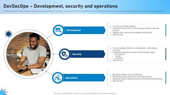 This slide discusses the working process of development, security and operations in DevSecOps. The purpose of this slide is to highlight the process followed by DevSecOps for providing, monitoring and managing security at each level of the software system. Find highly impressive Devsecops Development Security And Operations Role Of Devsecops Ppt Template on Slidegeeks to deliver a meaningful presentation. You can save an ample amount of time using these presentation templates. No need to worry to prepare everything from scratch because Slidegeeks experts have already done a huge research and work for you. You need to download Devsecops Development Security And Operations Role Of Devsecops Ppt Template for your upcoming presentation. All the presentation templates are 100 percent editable and you can change the color and personalize the content accordingly. Download now This slide discusses the working process of development, security and operations in DevSecOps. The purpose of this slide is to highlight the process followed by DevSecOps for providing, monitoring and managing security at each level of the software system.