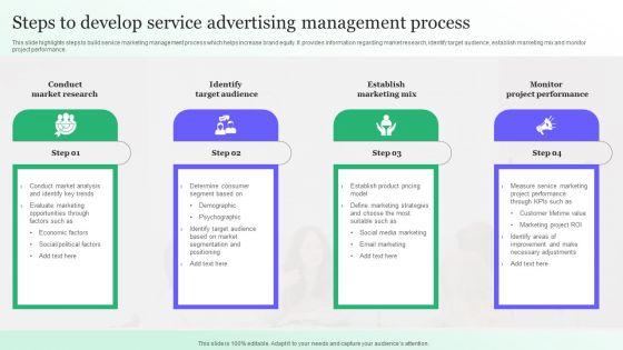 This slide highlights steps to build service marketing management process which helps increase brand equity. It provides information regarding market research, identify target audience, establish marketing mix and monitor project performance. Presenting Steps To Develop Service Advertising Management Process Icons PDF to dispense important information. This template comprises four stages. It also presents valuable insights into the topics including Conduct Market Research, Identify Target Audience, Establish Marketing Mix, Monitor Project Performance. This is a completely customizable PowerPoint theme that can be put to use immediately. So, download it and address the topic impactfully.