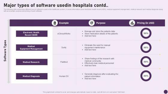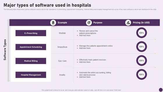 The following slide showcases various software used in day-to-day operations. E-prescribing, appointment scheduling, medical billing and hospital management are some of the major softwares which are mentioned in the slide. Take your projects to the next level with our ultimate collection of Guide To Healthcare Services Administration Major Types Of Software Used In Hospitals Icons PDF. Slidegeeks has designed a range of layouts that are perfect for representing task or activity duration, keeping track of all your deadlines at a glance. Tailor these designs to your exact needs and give them a truly corporate look with your own brand colors they will make your projects stand out from the rest.
